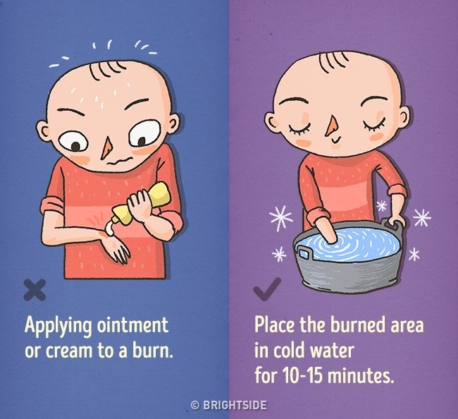 ▼燙傷後不要立刻擦藥膏:燙傷後應該將受傷部位在冷水中浸泡15分鐘,千萬不要先塗抹藥膏。這樣做的話多餘的熱量無法排除,反而會被困在患部。冰敷20分鐘或更久之後再塗抹藥膏比較好。