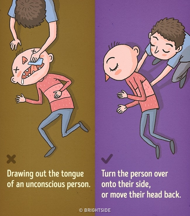▼不要將倒下後失去意識的人的舌頭拉出來:舌頭滑下去後可能阻塞呼吸道,可以幫他們保持側身,或者移動他們頭部,千萬不要拉舌頭。