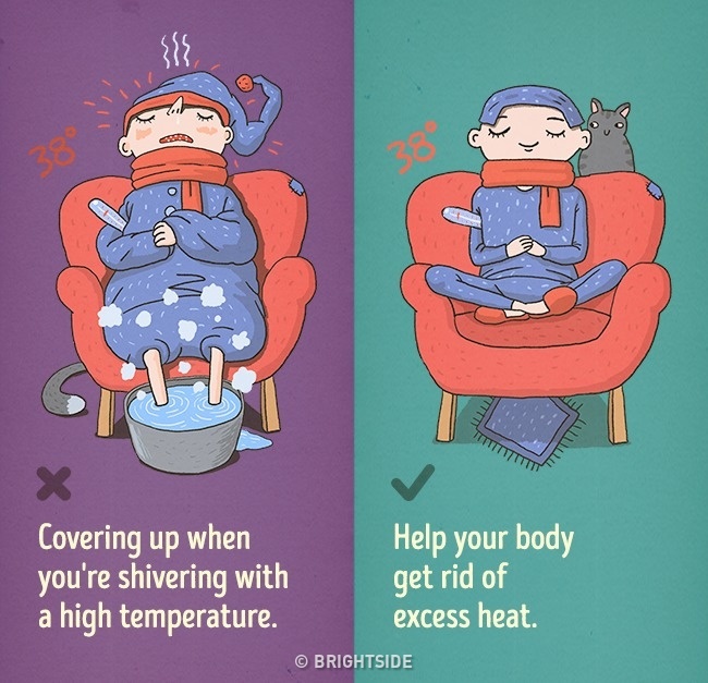 ▼發燒的時候不應該加衣:發燒的時候會出汗,這是因為體內溫度高。如果這時候將自己用更多衣物包起來,會讓體內溫度上升的更快。發燒、發抖的時候需要的是降溫,而不是更溫暖。