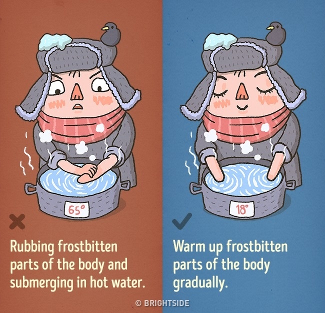 ▼不要磨擦凍傷部位:將凍傷的部位泡在冷水裡,等身體逐漸回溫。不要泡熱水,這會加劇傷害。