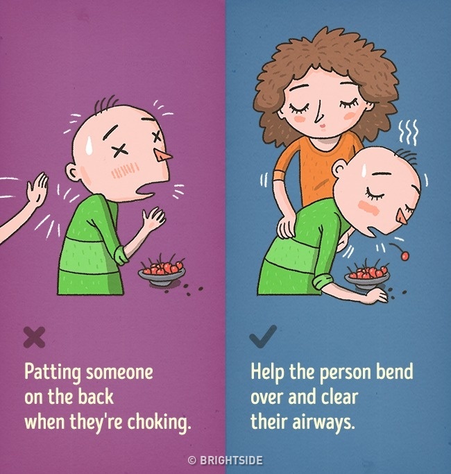 ▼不要拍噎到人的背:拍打背部反而會讓卡住的東西更往下滑,所以應該傾斜他們的身體,安撫他們,讓他們保持冷靜,然後指導他們緩慢呼吸兩次。這樣做有助於緩解窒息,還可以慢慢破壞阻塞物,恢復呼吸。
