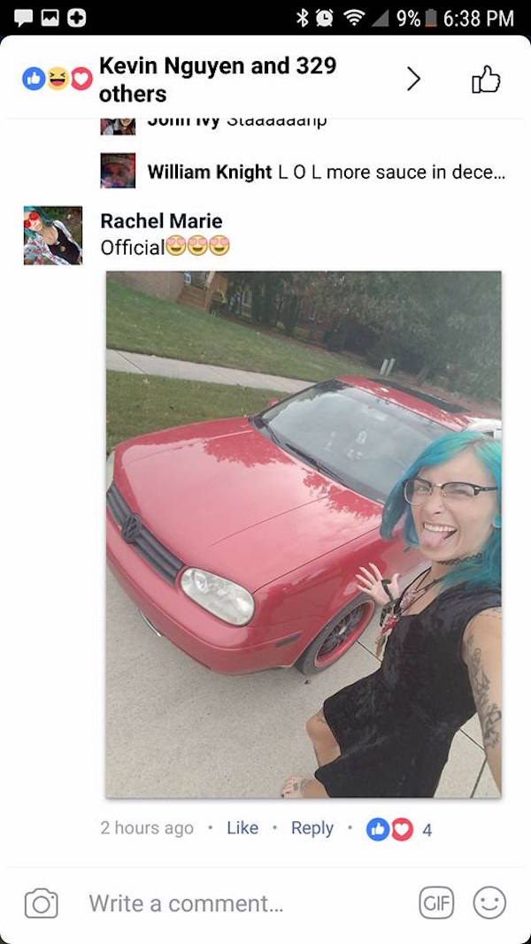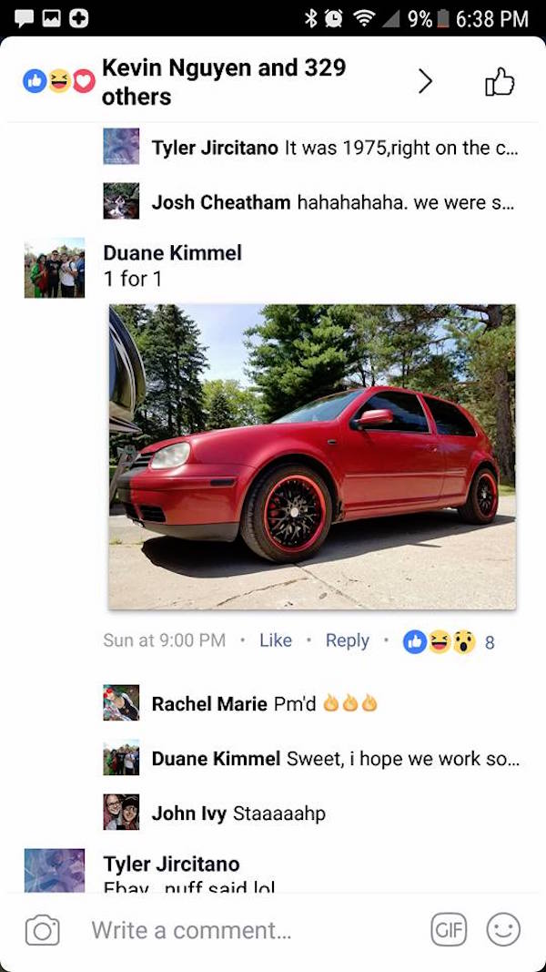▼一開始,包括瑪麗都不相信這個交易會成功,但杜安竟然是說真的!瑪麗不久後貼出自己與車的合照,說:「感謝這筆瘋狂的交易,用傳奇的木蘭四川醬換到了一部2004年的紅色Volkswagen GOLF MK4,我祝福你沉醉在醬汁中,恭喜你老兄!」