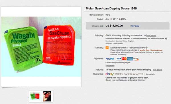 ▼結果麥當勞也真的聽從網友的請求,復刻了這款「木蘭四川醬」!它立刻成為許多人瘋搶的對象,還有網友稱他在eBay上以15000美元(約45萬台幣)的價格賣出了舊版沾醬。