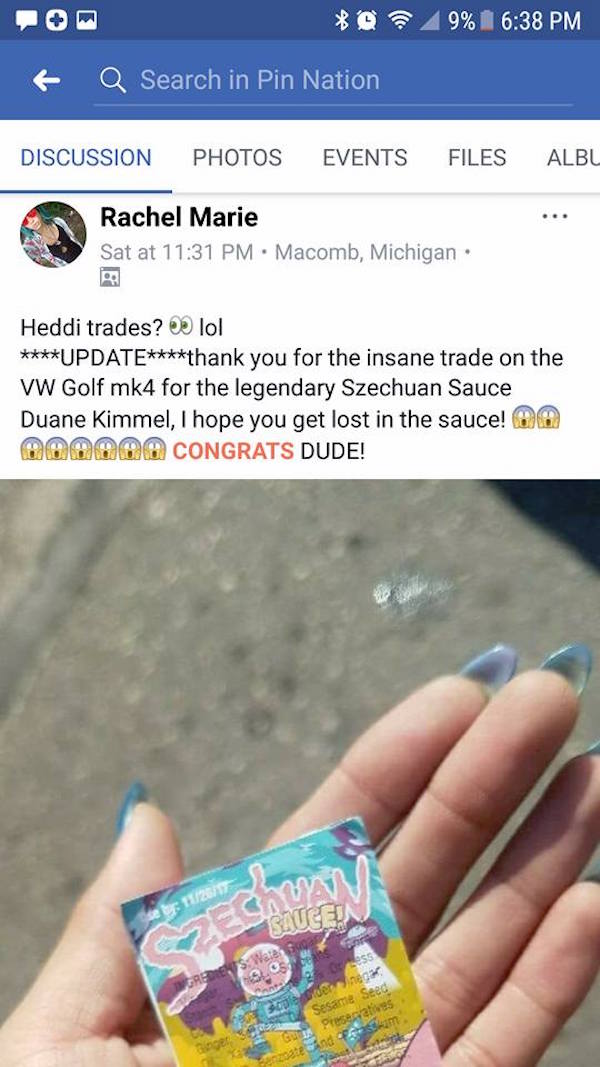 ▼新版沾醬則結合了卡通的畫風,日前,美國密西根州一位女子瑪莉(Rachel Marie)在一個胸針的臉書社團中,想用木蘭四川醬來跟別人交換胸針蒐藏,結果底下一位網友杜安(Duane Kimmel)貼出一張車照,說:「以一換一。」
