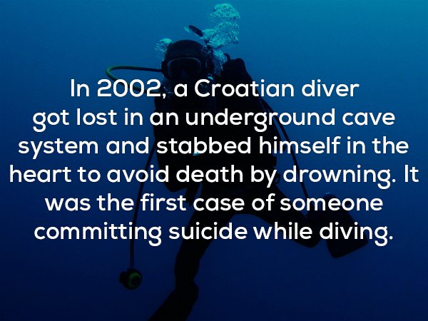 ▼7. 2002年,一位柯羅埃西亞的潛水者在探索水底洞穴時迷路,為了不被溺死,他只好刺穿自己的心臟自殺。這也是在潛水中自殺的首例。