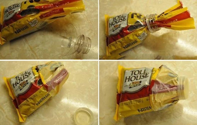 ▼將塑膠瓶的上半部分剪下來,用來密封小食品。
