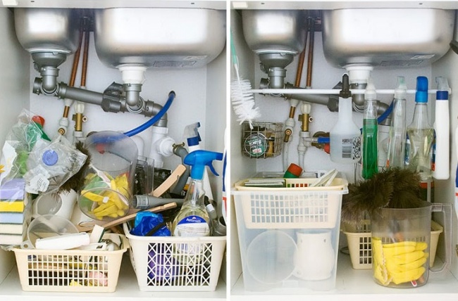 ▼在水槽下放一根橫桿,將能夠掛起來的東西全部掛好,看起來會整齊很多。