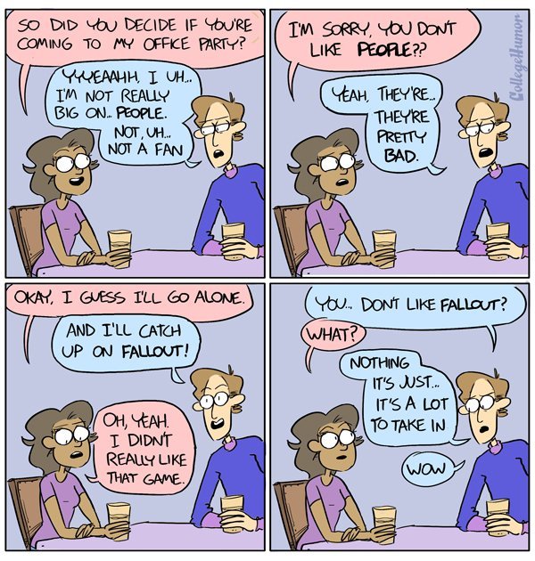 「你要來參加我的工作派對嗎?」「嗯……我……我不太喜歡……人……」
