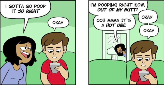超級親近關係,大便時討論這個問題:「我拉出來啦!天哪,超爽的!」「好啦好啦。」