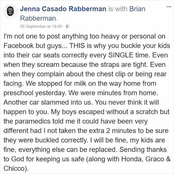 ▼這位名叫珍娜(Jenna)的媽媽發文說:「我本來不打算在臉書上講一些太沉重或私人的話題,但是,你們真的每次都要把你們的孩子緊扣在汽車的兒童安全座椅上!即使孩子因為座椅的背帶太緊或尖叫,也記得要這麼做!」