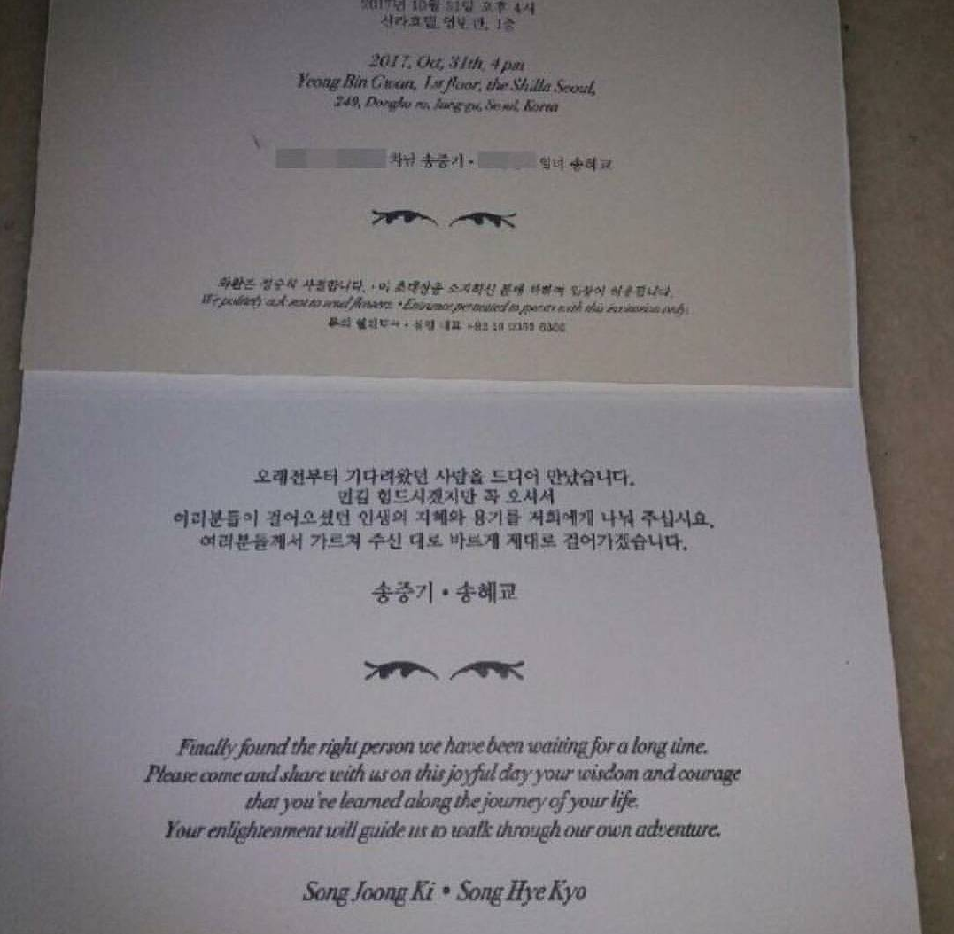 ▼喜帖的內容除了典禮的時間、地點等資訊,還有用韓文、英文寫下的甜蜜告白:「長時間的等待,終於等到對的人」、「請來和我們分享你生命旅程中的智慧與勇氣,您的啟發將帶領我們走向未來的冒險。」上面還有「次子」宋仲基父母的名字、「獨生女」宋慧喬媽媽的名字,落款則是雙宋。
