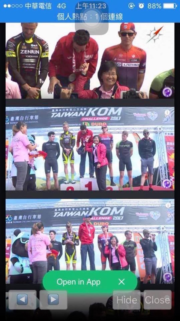 ▼這次登山賽的冠亞季軍分別由義大利選手「鯊魚」Vincenzo Nibali、西班牙選手Oscar Pujol、丹麥選手John Ebsen獲得。但網友發現在觀光局副局長陳淑慧頒獎時,她把獎牌掛上Nibali頸上後,就直接拉著獎牌合照,讓Nibali只能低頭照相。