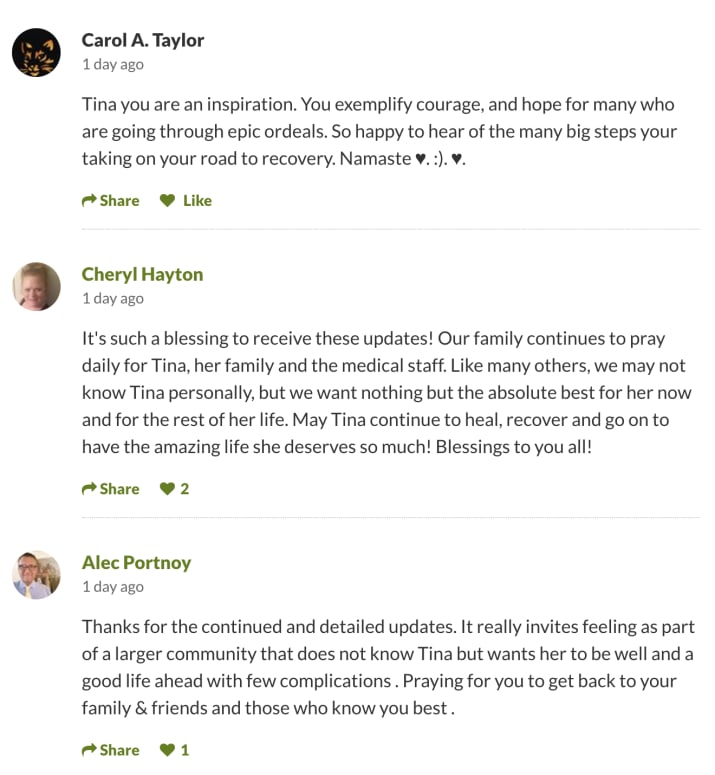 ▼Tina的康復讓人很振奮,她的GoFundMe頁面被分享了50000多次,已經募集到了600000美元(約新台幣1800萬元)善款。大家紛紛獻上祝福,希望她早日康復。親友們給她加油鼓勁,同事們也希望她能夠早日回到工作崗位。