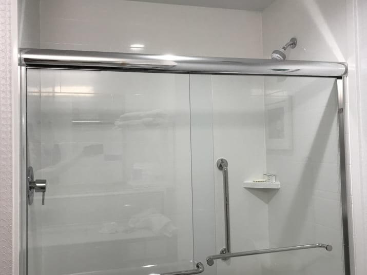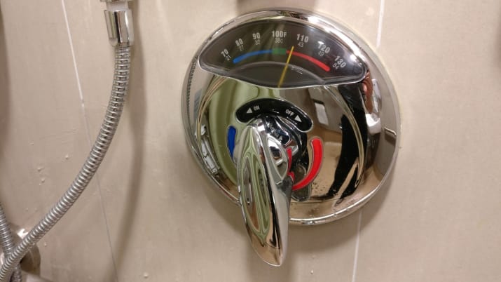 ▼蓮蓬頭與開關在不同的牆上,打開時水不會噴到臉上。