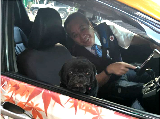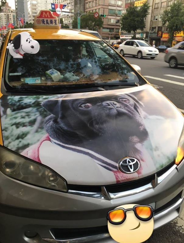 2017年10月24日近日台北市街頭有一台造型特別的小黃在馬路上十分顯眼,原來車前殼上貼著一隻巴哥犬的照片,原來這是一台寵物友善的計程車,除了司機大哥之外還有一位9歲的副駕駛「大雄」!