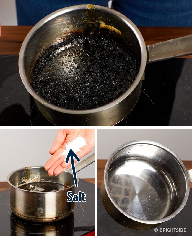 ▼煮沸鹽水清潔鍋子:用燒焦的鍋子煮鹽水,煮15到20分鐘再清潔,很容易就能恢復原貌。