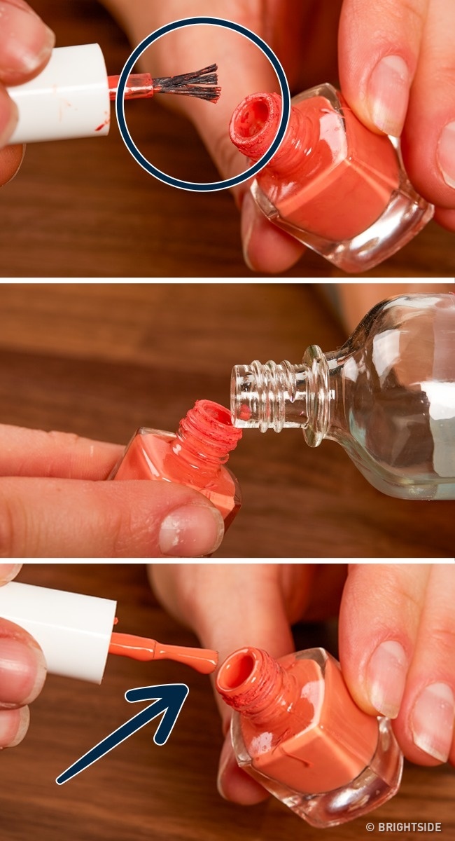 ▼在乾指甲油中加去光水:指甲油乾掉的話可以加幾滴去光水,但不要加太多,否則會變得很稀。