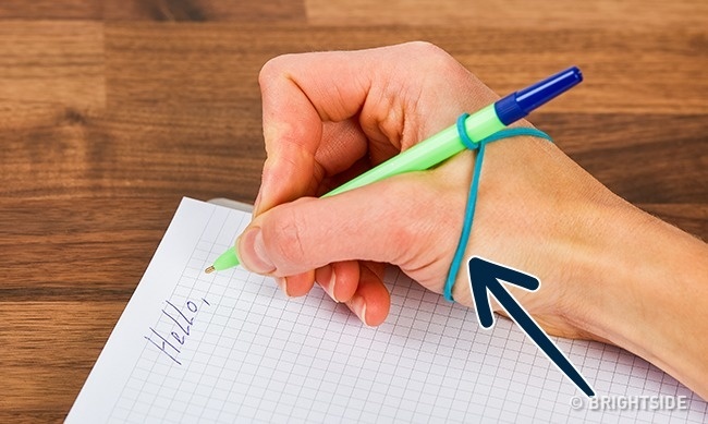 ▼用橡皮筋糾正握筆姿勢:在手上套一根橡皮筋,握筆時將橡皮筋纏繞在筆桿上,寫字的時候筆就能在正確的位置。