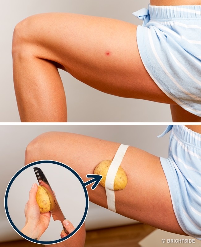▼用馬鈴薯止癢:被蚊蟲叮咬的話,將馬鈴薯洗乾淨切成兩半,取一半固定在叮咬處。這樣做能夠止癢消炎,還能加快癒合速度。