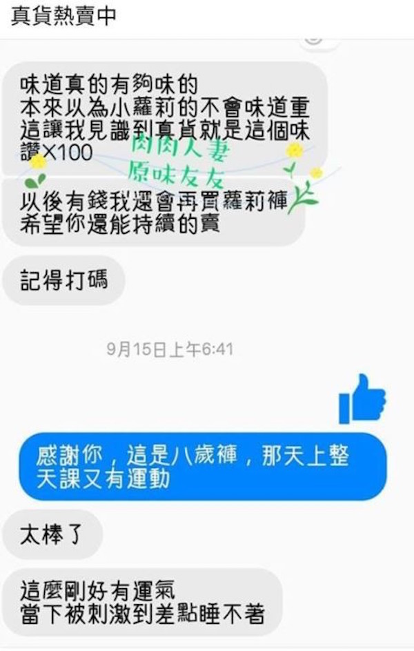 ▼這位三寶媽完全不擔心女兒的內褲外流,還強調女兒「那天上整天課,又有運動」,買家消費以後也是讚不絕口,回說「味道真的有夠味的」、「本以為小蘿莉的不會味道重,這讓我見識到真貨就是這個味道」、「這麼剛好有運氣,當下被刺激到差點睡不著」。