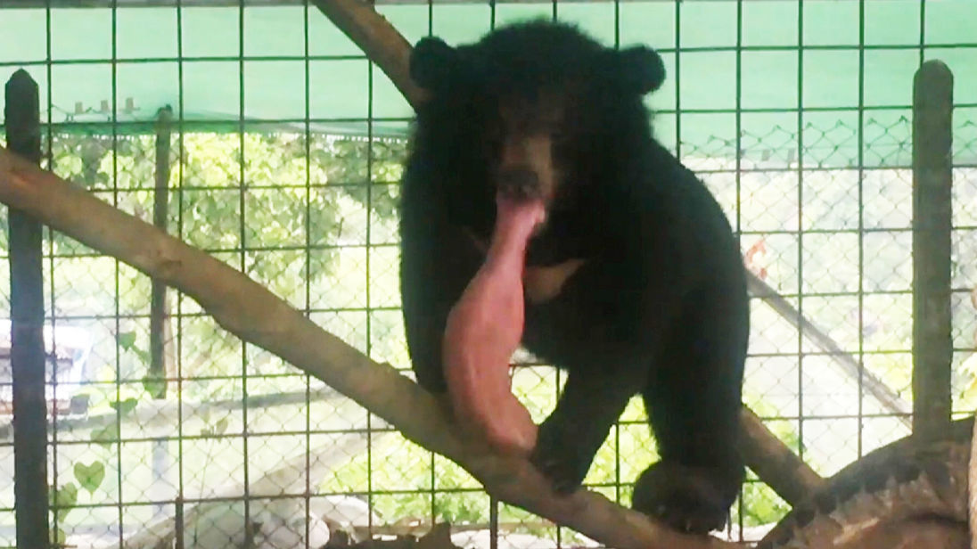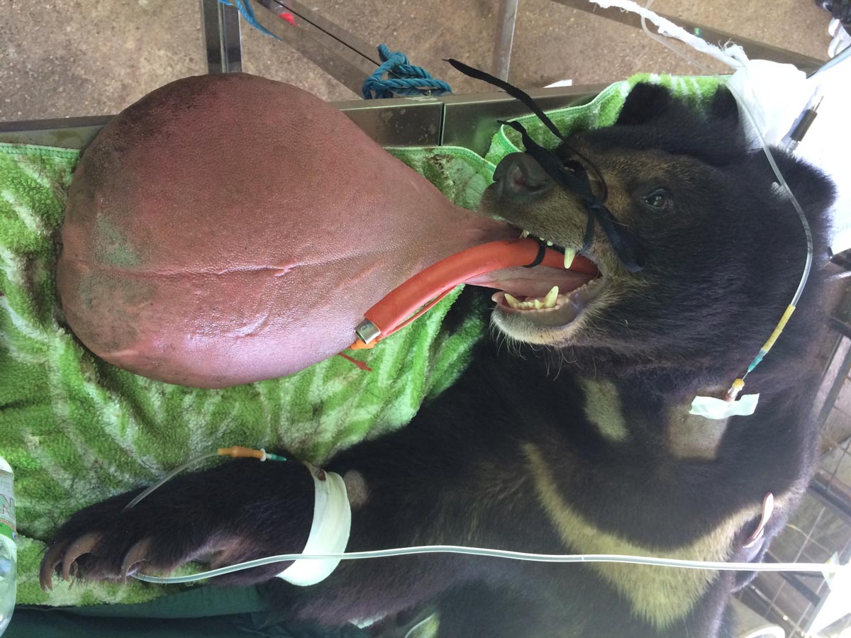 牠很痛苦!亞洲幼熊「舌頭遭到感染變成3公斤重」,僧侶發現後馬上營救!