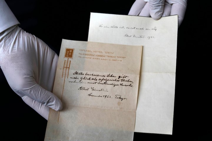 ▼1921年時,愛因斯坦獲得了諾貝爾物理學獎。那時候還沒有網路,愛因斯坦雖然在專業領域很出名,但普通人對他並不熟悉。1922年時,他到東京演講,住在帝國飯店(Imperial Hotel),一名郵差去飯店給他送信,當時他身上沒有零錢付小費,就隨手寫了兩張信籤。