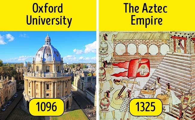 阿茲特克的城市特諾奇提蘭特(Tenochtilan)大約建於1325年,而牛津大學雖然沒有明確記載成立的時間,不過他們在1096年就已經開始教導學生了。