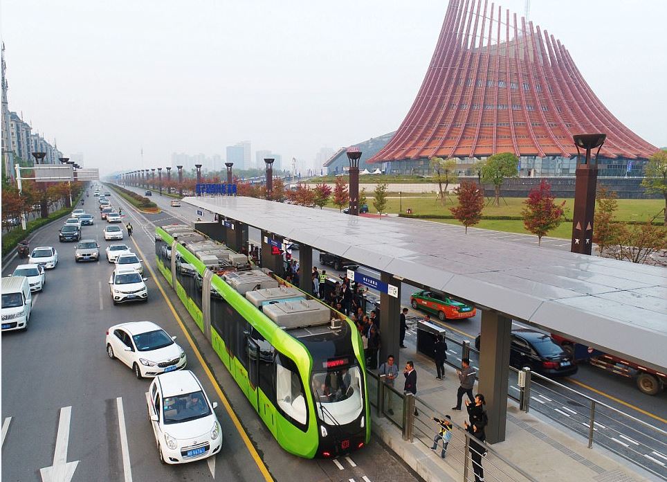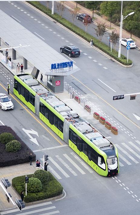 ▼中國中車於2013年開始進行設計無軌列車,輪胎結合了中國中車的版權科技內容,使用橡膠輪胎,而胎框則是塑膠而非鋁圈。這樣的無軌列車的感應器生命週期可達25年,而且只需要充電10分鐘即可行駛15.5公里。