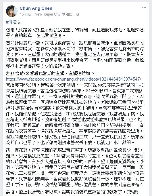 ▼不過因為有報導表示他因為「露毛」而被警察關切,不堪其擾的他也在臉書發文澄清自己沒有「露毛」。