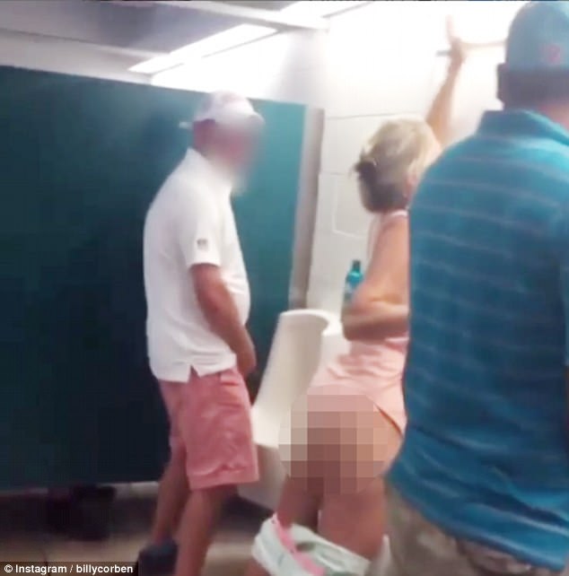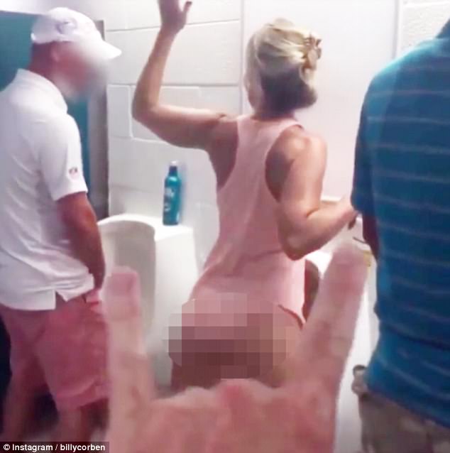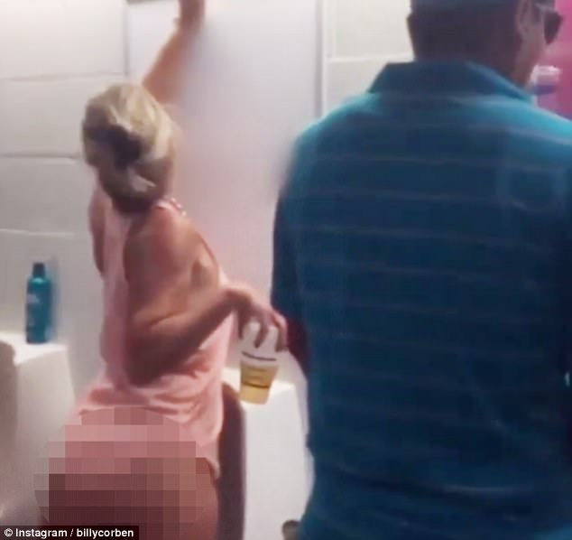 ▼這個過程都被一旁的人用手機錄下,只見這位身穿粉紅色上衣的女子一手拿著啤酒,將短褲和內褲都褪到大腿處,靠著小便斗就開始「解放」,大方的態度讓她獲得許多喝彩。