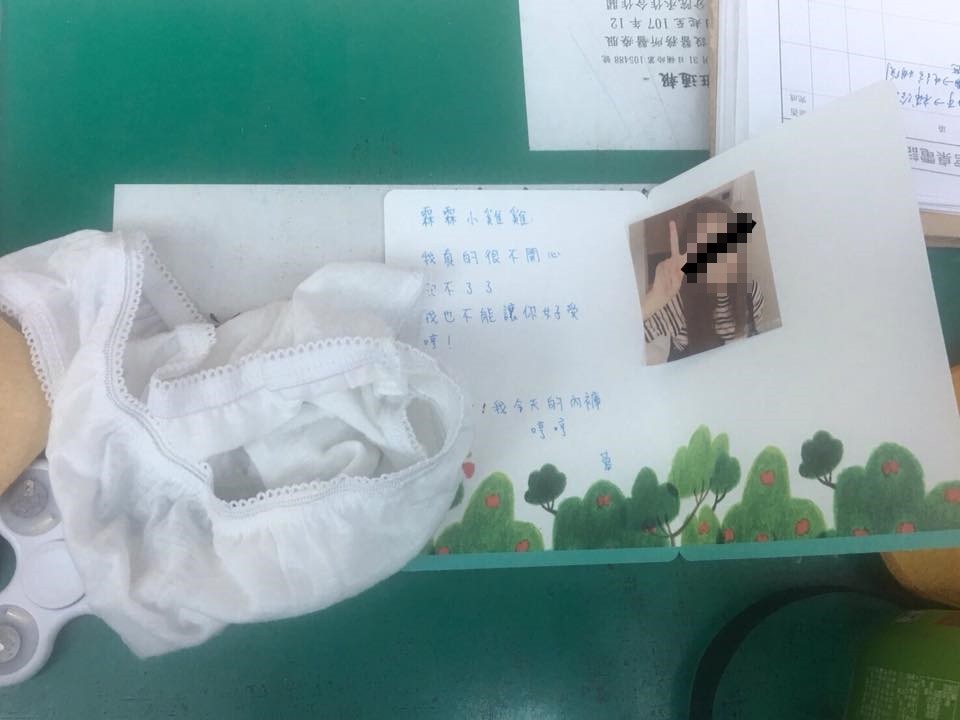 ▼原來這位菜鳥役男在新訓懇請日時收到了女友所寄來的親筆信,拆開來之後發現除了卡片之外,竟然還有一件女性的白色小內褲。卡片內除了有一張女性自拍照,旁邊還寫著:「霖霖小雞雞,我真的很不開心,抱不了了,我也不能讓你好受,哼!我今天的內褲,哼哼!」