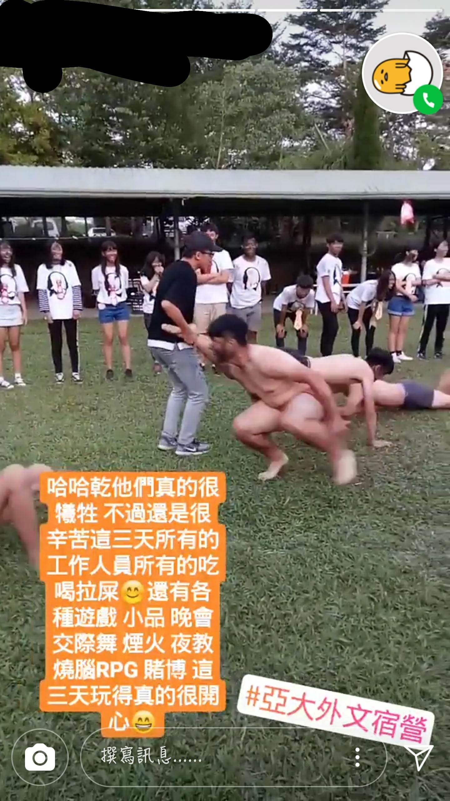 2017年11月02日大學校園的「迎腥宿營」又添一樁!一位網友貼圖爆料亞洲大學外文系的迎新活動,只見圖片中學生「脫到剩內褲」,讓他直呼「很噁心」,也再度掀起迎新宿營活動安排上的問題。