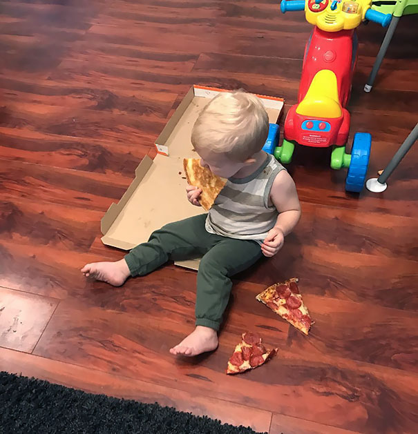 ▼迷糊的爸媽都沒有發現小孩拿走了披薩盒,正坐在地板上吃。