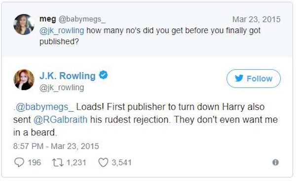 羅琳的故事充滿了激勵,在歷經無數沮喪的退件後,她書寫的文字終於風靡全世界。看到現今的《哈利波特》那麼走紅,想必當初拒絕羅琳的出版商超級崩潰吧…