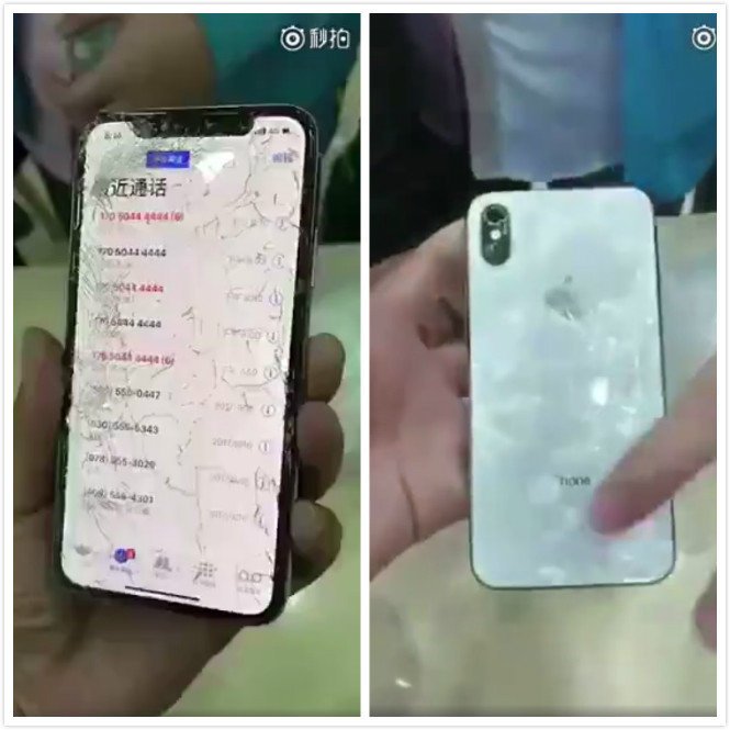 2017年11月04日蘋果十周年紀念版iPhone X於11月3日開賣,現在已經發生了全球首碎悲劇。大陸網路上瘋傳的一段影片顯示,一名網友的iPhone X前後玻璃都碎成蜘蛛網狀。拿著手機的男子無奈表示:「這樣是不是更好看一點?是不是更好看一些?更有特色吧。」