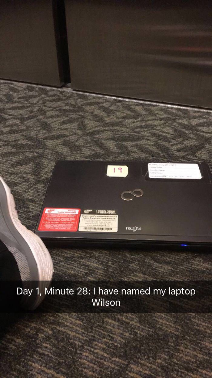 ▼「第一天,28分鐘:我給我的筆電取名為Wilson。」