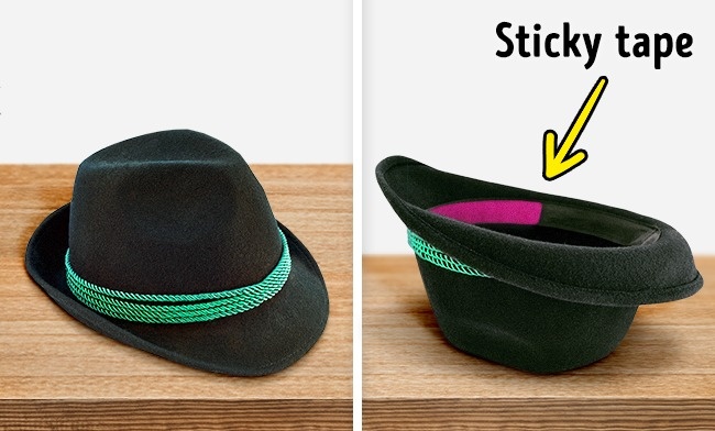 ▼防止帽子沾上化妝品:將膠帶貼在帽子內部、接觸額頭的部分,就不用怕化妝品弄髒帽子了。