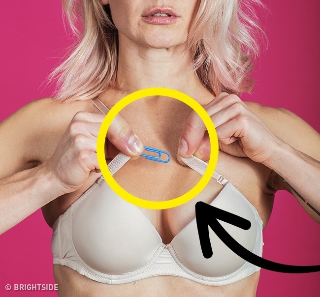 ▼用迴紋針藏起內衣帶:露肩背心很性感,但露出來的內衣帶很醜,用迴紋針將內衣帶拉到中間,不僅能「隱形」,還能防止肩帶滑落。