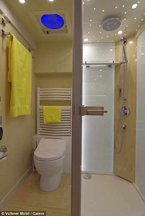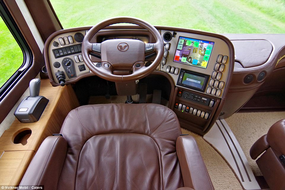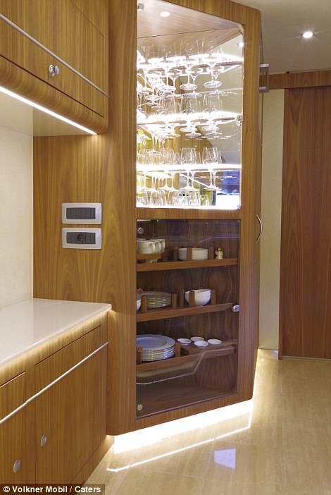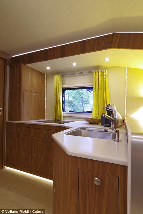 ▼廚房內設施齊全,木質和皮質的傢具非常舒適,露營車內還有頂尖的娛樂設施。能夠滑出來的牆壁設計擴張了車內的空間。