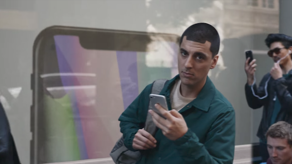 ▼在廣告的最後,主角終於決定捨棄iPhone,改用三星最新的手機。當他看到依舊在搶購iPhone X的果粉時,不以為然地搖了搖頭…(有趣的是,這個排隊的果粉還留了和iPhone X一樣的髮型。)