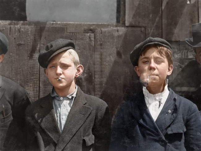 ▼21. 1910年,報童正在吸菸休憩。(後期上色)