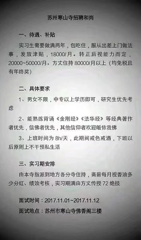 2017年11月09日最近這幾天,蘇州城外佛教名寺「寒山寺」的徵人啟事引起了很多人的關注。只見上面寫著:「招聘和尚:實習生需要做滿兩年,包吃住,必須要出差做法事,每月薪水新台幣82000元起跳,視能力轉正職則加薪到新台幣91000-228000元/月。職涯發展到最上級的方丈住持,薪水約為每月365000元。」