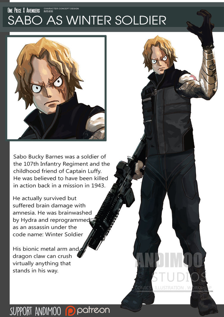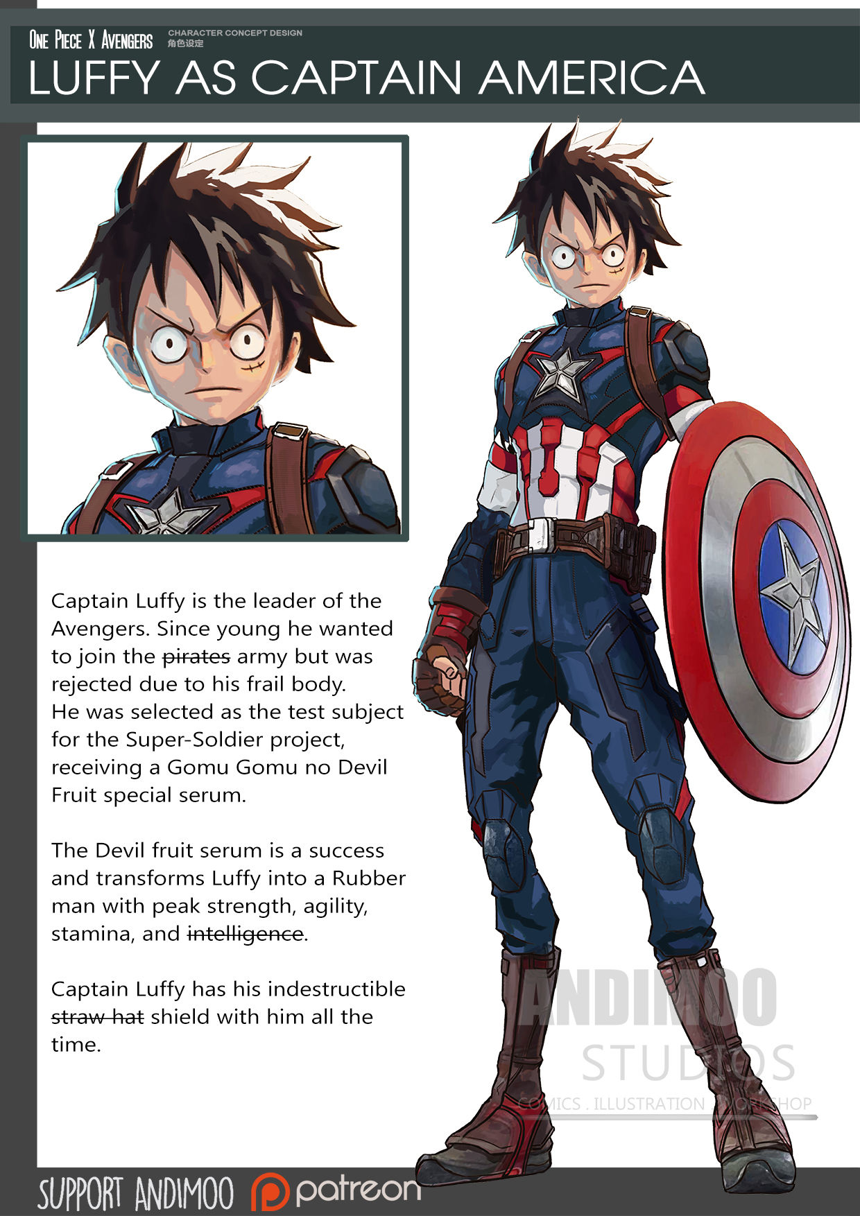 ▼「美國隊長」魯夫:他是「復仇者聯盟」的隊長。魯夫從小就希望成為一名軍人(海賊),但因為身體不夠強壯,一直沒能如願。後來他被選為「超級士兵」計畫的實驗者,吃下「橡膠惡魔果實(血清)」的他徹底進化,變成了行動敏捷、體力與速度驚人的超級橡膠戰士。他擁有強大的力量,隨身帶著的標誌性裝備是盾牌(帽子)。