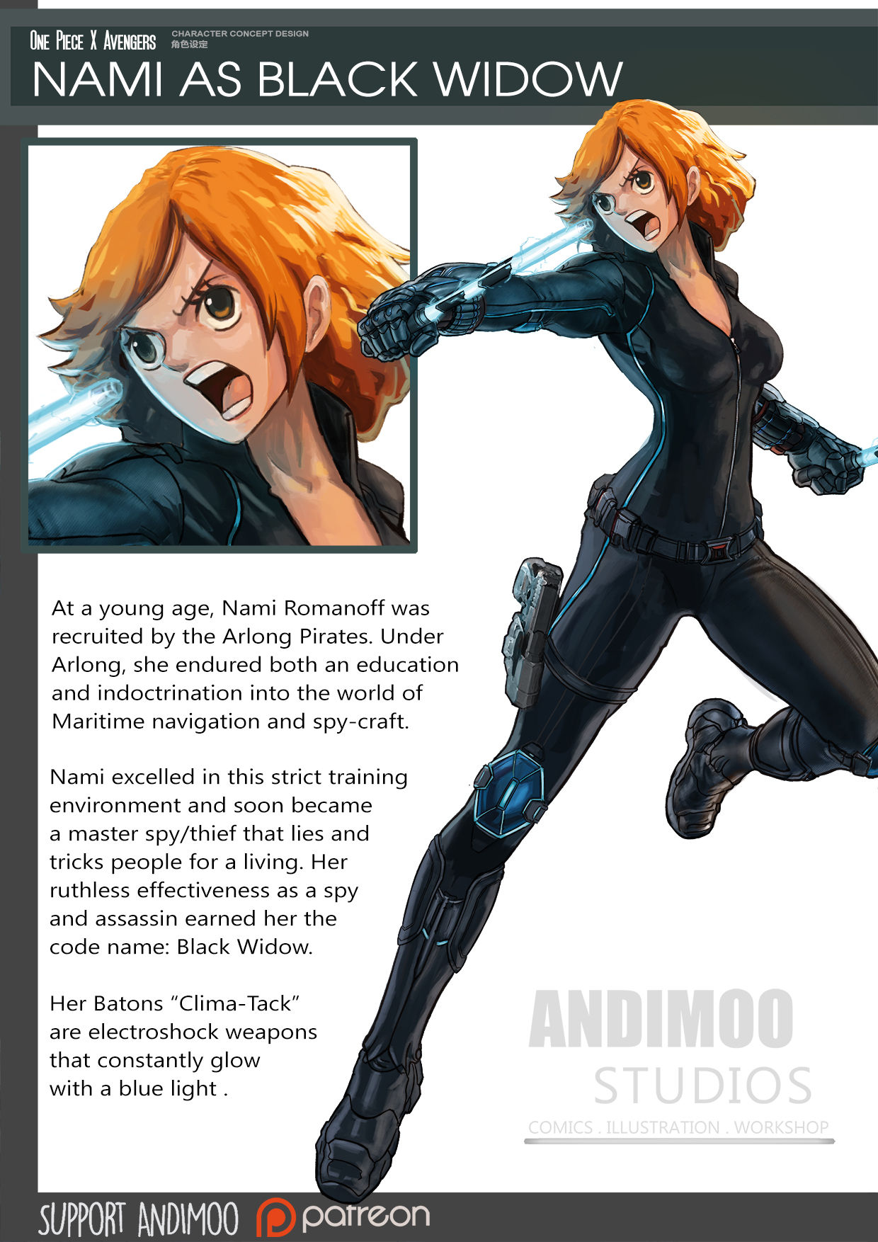 ▼「黑寡婦」娜美:她年輕時被惡龍海賊團帶走,在嚴苛的教育訓練下學到了航海知識,還成為了一名頂尖間諜(竊賊)。她擅長偽裝、欺騙、暗殺,精通詭計,所以被稱為「黑寡婦」。她的武器是「天候棒」,能夠發出藍光,控制天氣。