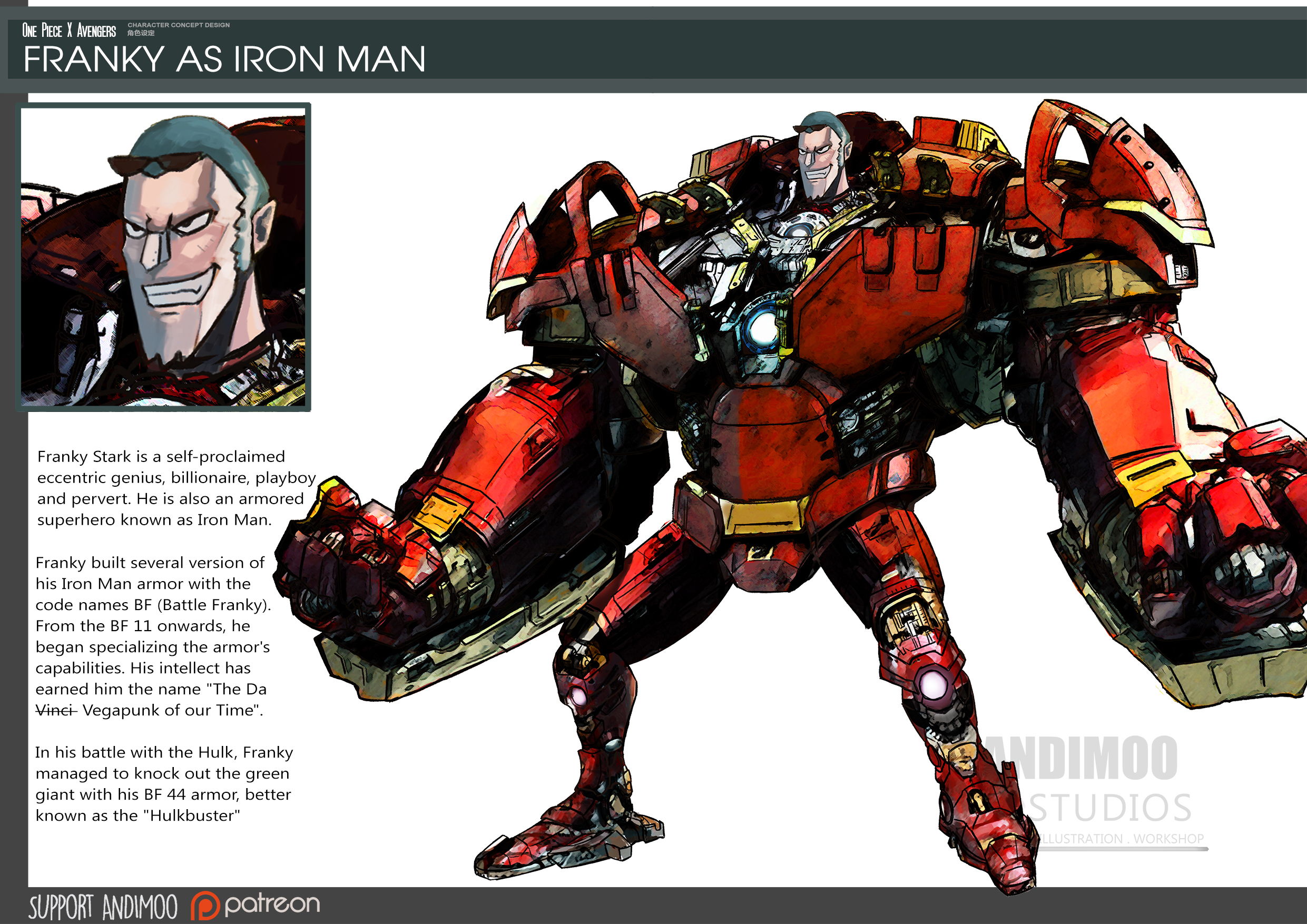 ▼「鋼鐵人」佛朗基:他是個自稱天才、花花公子、百萬富翁的變態,穿上盔甲後卻變成了正義的鋼鐵人。他性格古怪,為鋼鐵戰甲設計了很多新功能,還打造了很多版本,代號為「BF」(戰鬥佛朗基)。他自BF11後開始優化盔甲的能力,更贏得了「當代貝卡帕酷博士」的美稱。