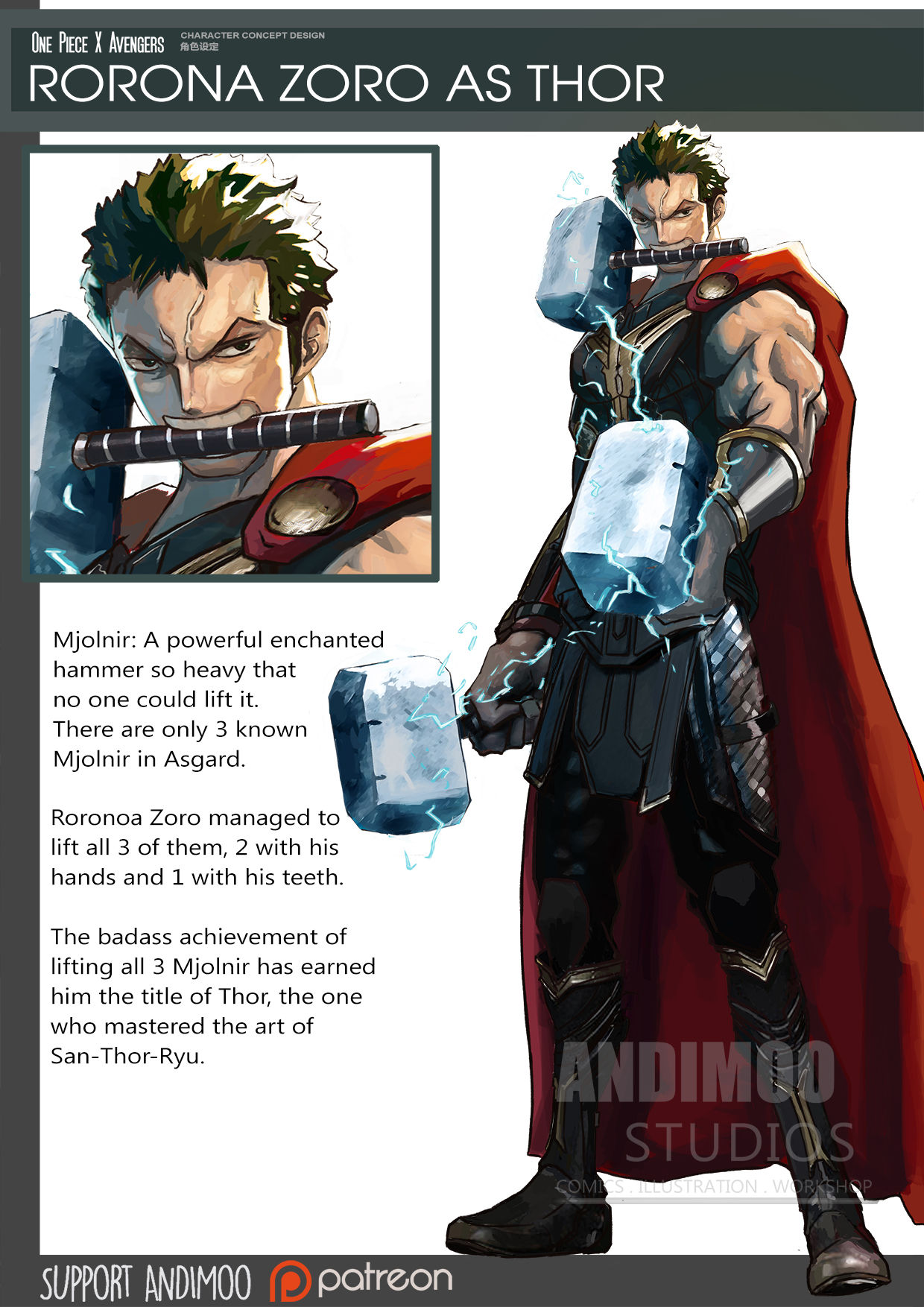 ▼「雷神」羅羅亞·索隆:阿斯加有3把被施了魔法,沒人能夠拿起的錘子,只有索隆能夠一次全部拿起來。他手中拿著兩把,還用牙齒咬著一把,贏得了「三槌流」大師的美名,也被稱為「雷神」。