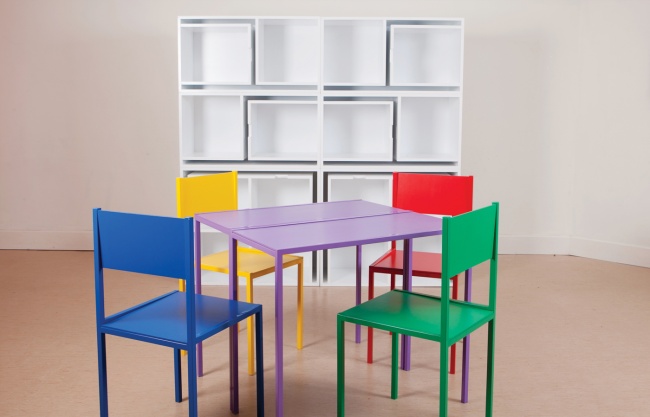 ▼書櫃+桌椅:不用的時候就把桌椅收起來,彩色的桌椅很多生活情趣。