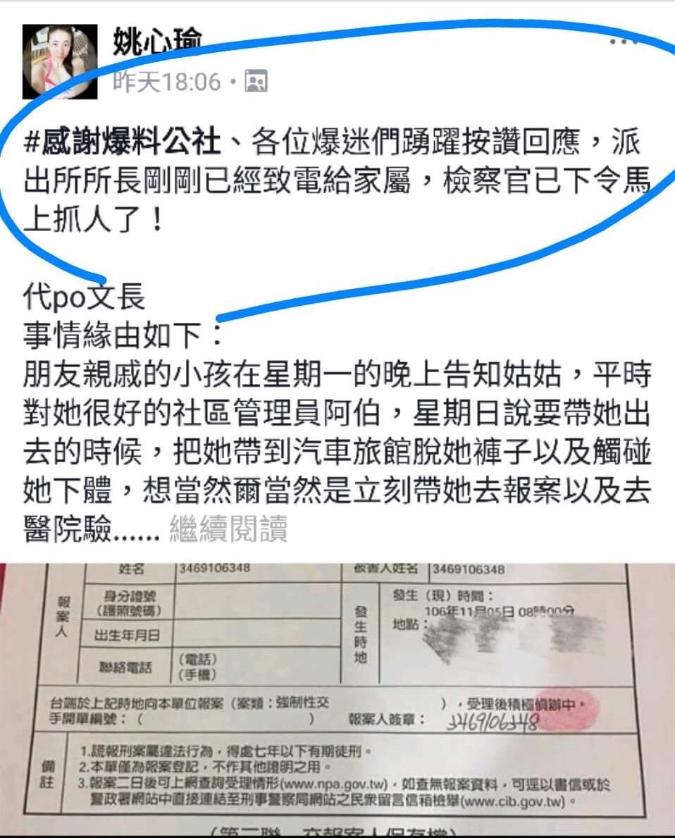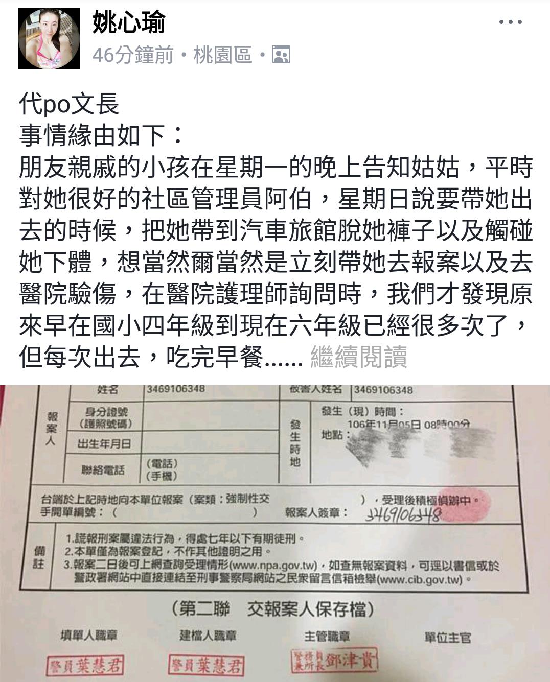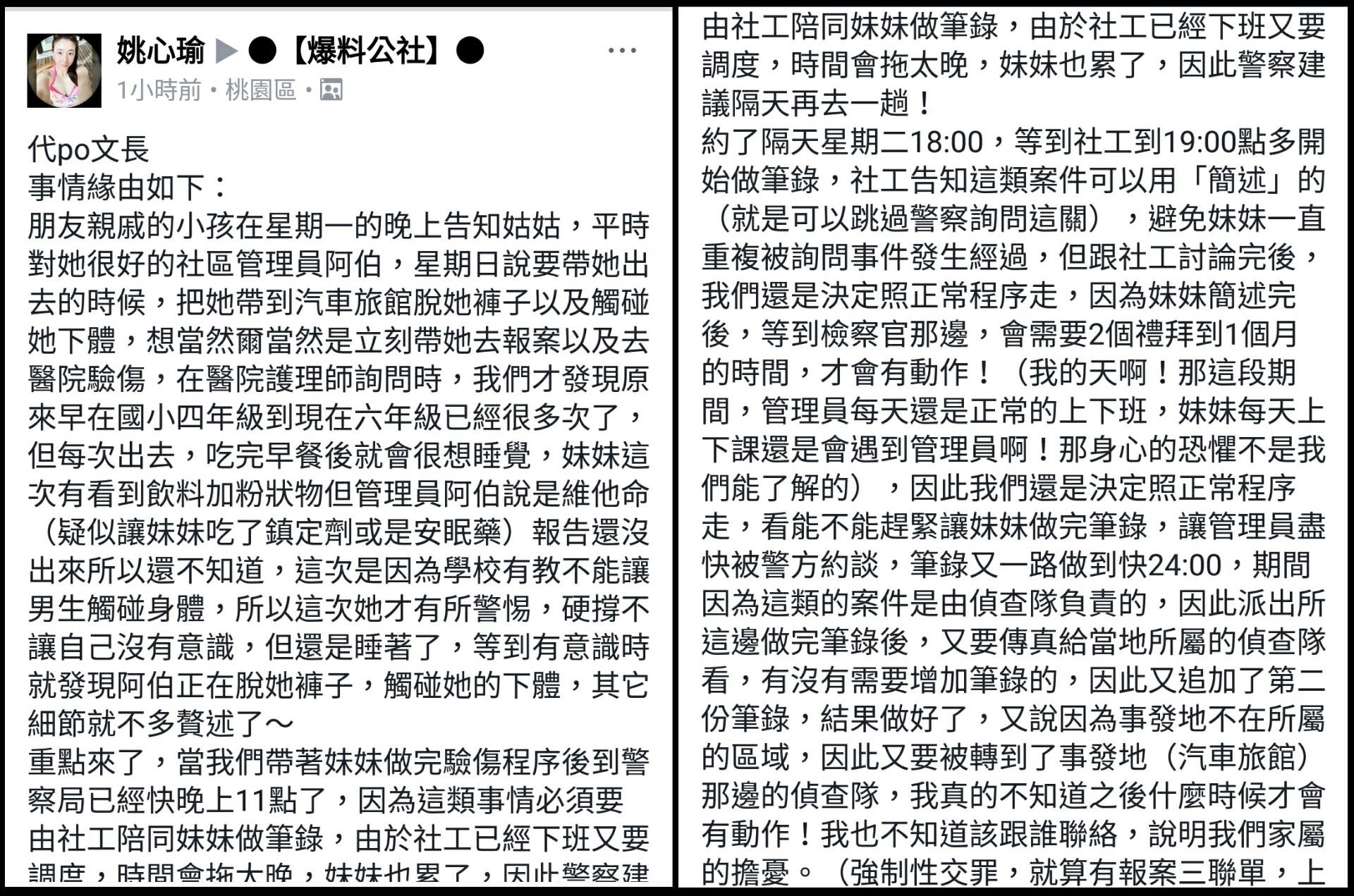 ▼近日於網友在臉書《爆料公社》上表示,朋友親戚的一名家住桃園市的小六女童因為母親罹患癌症正在接受化療,家中只剩下她與1歲半的妹妹。而社群管理員阿伯竟然利用雙方平時熟識的關係,將女童帶到摩鐵性侵。