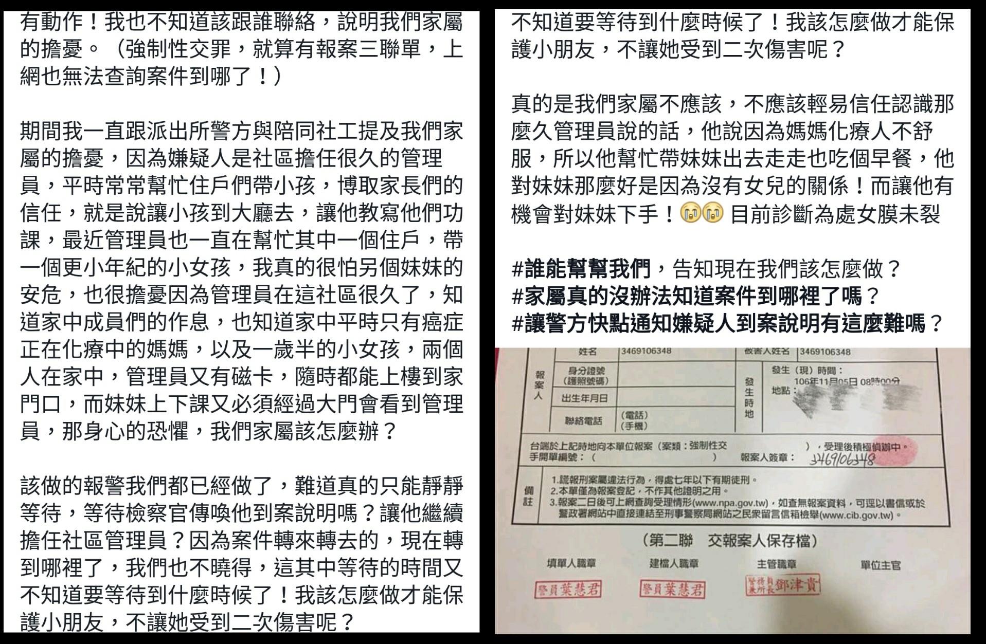 據悉這名保全已經在這裡任職了4年多,平時也經常幫助住戶帶小孩,很被家長們所信任。當女童家人報案之後,警方做完筆錄之後竟表示事發地點不在所屬的區域,因此這起案件將被賺到摩鐵所在地中壢地區的偵察隊。家人也很擔心女童每天上下課都會見到那位管理員,也不知道該怎麼辦才好。