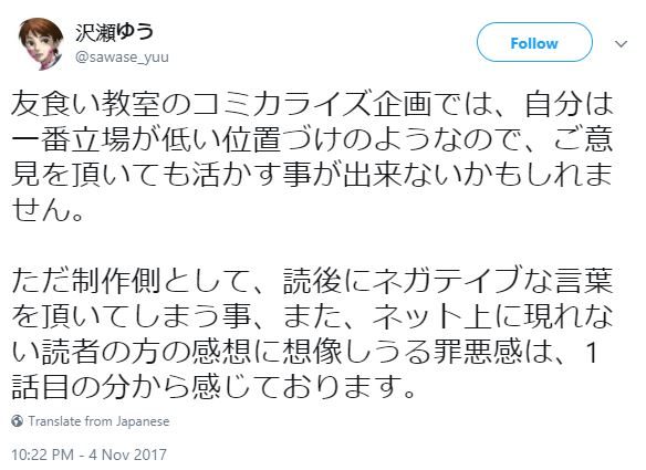 ▼不過兩位作者的態度倒是很大方,負責作畫的沢瀬ゆう表示:「我在本漫畫的企劃當中,處於最低階的位置,也許無法轉告各位的意見。其實我從第一話就做好了心理準備,早就想到會收到這樣的負面評價了。」